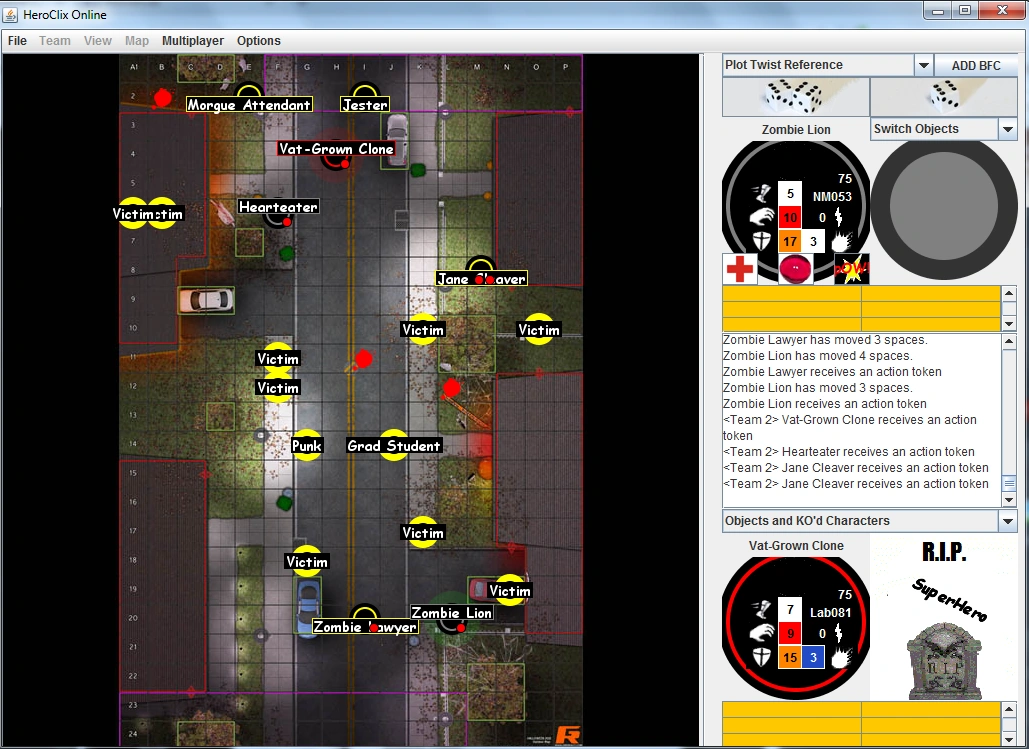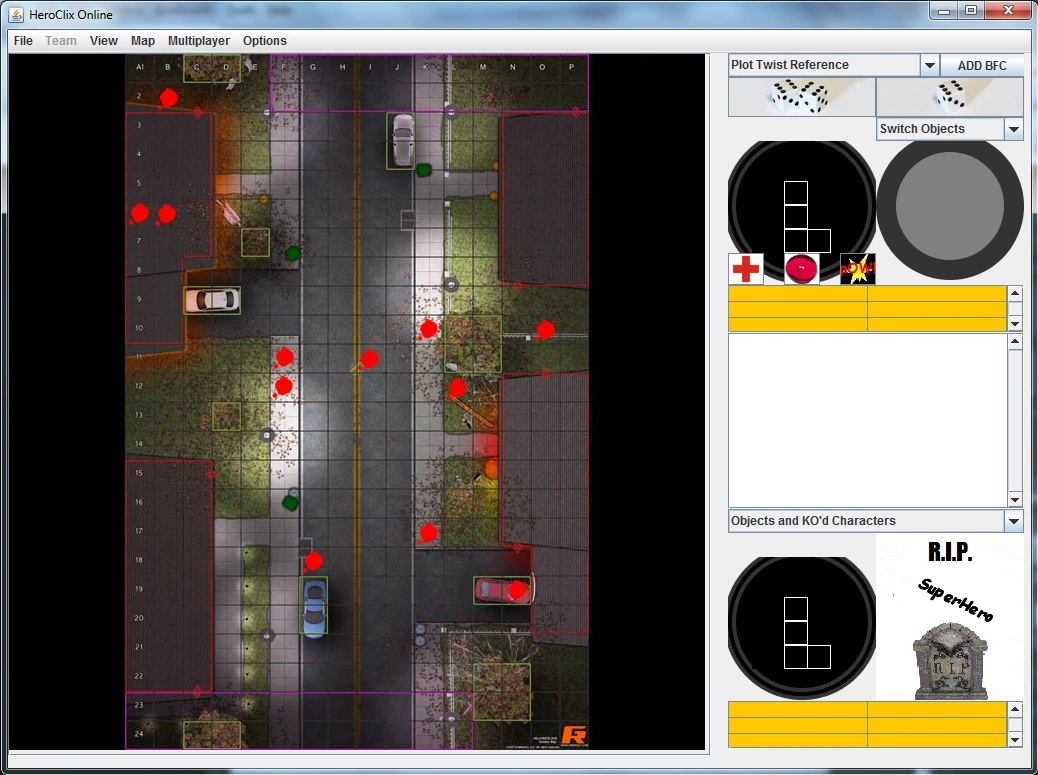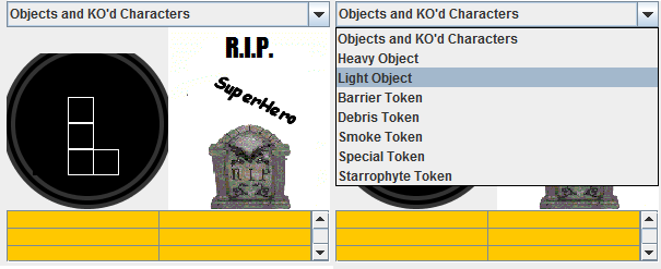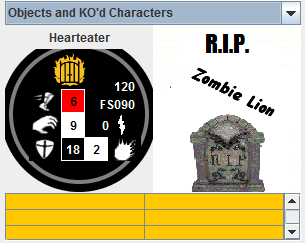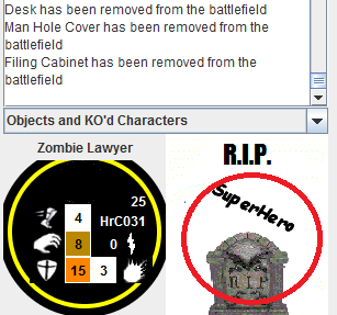 Dragging any figure or victim/object onto the Graveyard will remove it from the battlefield. The name of the most recent figure removed will be displayed. If a figure needs to be returned to the battlefield, this can be done by clicking on the Objects and KO'd Characters menu and selecting the desired figure from the bottom of the list.
