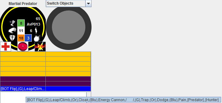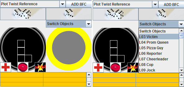 The Switch Objects Menu is directly underneath the 1d6 button. Depending on whether you have a light object or a heavy object selected, it will display a list of either victims or objects.