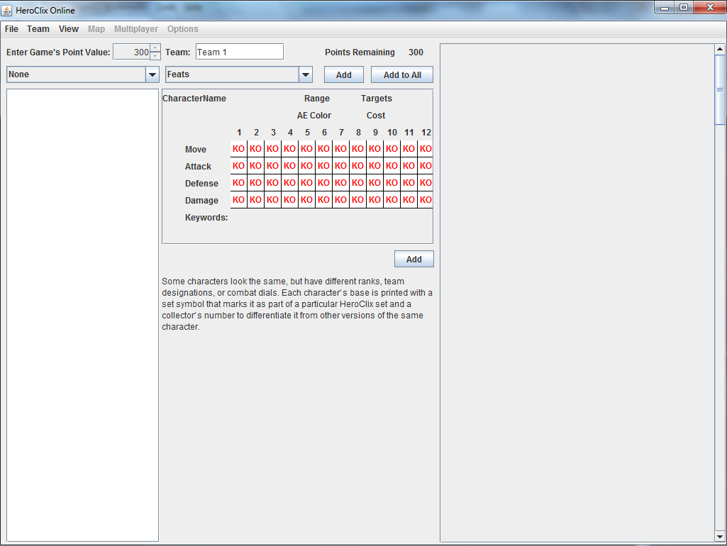 This is the first screen you will see when you open the program. There is a menu on the left side of the screen that show every HorrorClix set. Choosing one will fill the list below it with all the figures from that set. Selecting one of those figures will display the monster's dial and Keyword Line (see Keyword Line/Card below) in the middle of the screen. To add the selected figure to your team, you must then click the Add button underneath the dial. This will add the figure to the list on the right. Double clicking a figure from that list will remove it from the team.