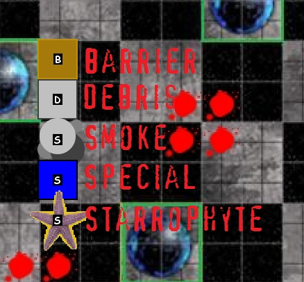 HorrorClix Online features 5 simple terrain markers: Barrier, Debris, Smoke, Special and Starrophyte. In HeroClix, Barrier markers represent Blocking Terrain, and Debris and Smoke markers represent Hindering Terrain. Special and Starrophyte tokens are for anything else that doesn't fit the other two definitions. Feel free to use these markers however you see fit, but make sure the other player(s) understand.