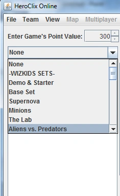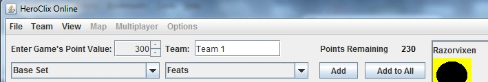 The "This Game's Point Value" prompt at the top left of the screen is pretty self-explanatory. Clicking on one of the arrows adds or subracts 50 points from the build total. When figures are added to your team, their point values will be subracted from the "Points Remaining" number on the right.