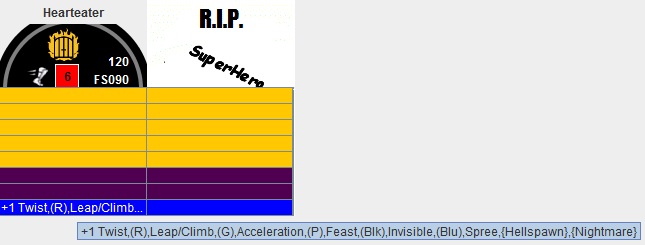 Because the original program, Open HeroClix, was created a long time ago and designed to play HeroClix, not HorrorClix, many things had to be improvised. In order to include monster cards, Sarcanis had to abbreviate them and fit them into the Keyword line of each figure. HorrorClix Online assumes you know all of the powers from HorrorClix 1.0, or at least have access to our Powers page. Therefor, they are listed only by power name.