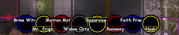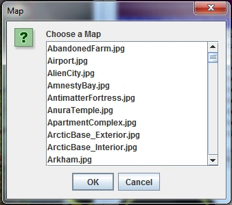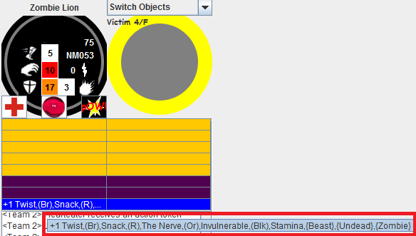 It is impossible to add images to the program for individual figures. Instead, each monster, victim and object is represented by a plain colored circle on the map with its name labeled on top of it. Only one friendly monster and one opposing monster can be viewed in detail at a time. Monster cards exist in a purely textual, highly abreviated form. Hourglasses on dials are represented by the number 46 inside a gray square (