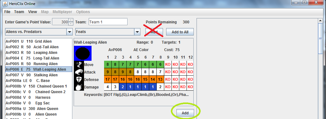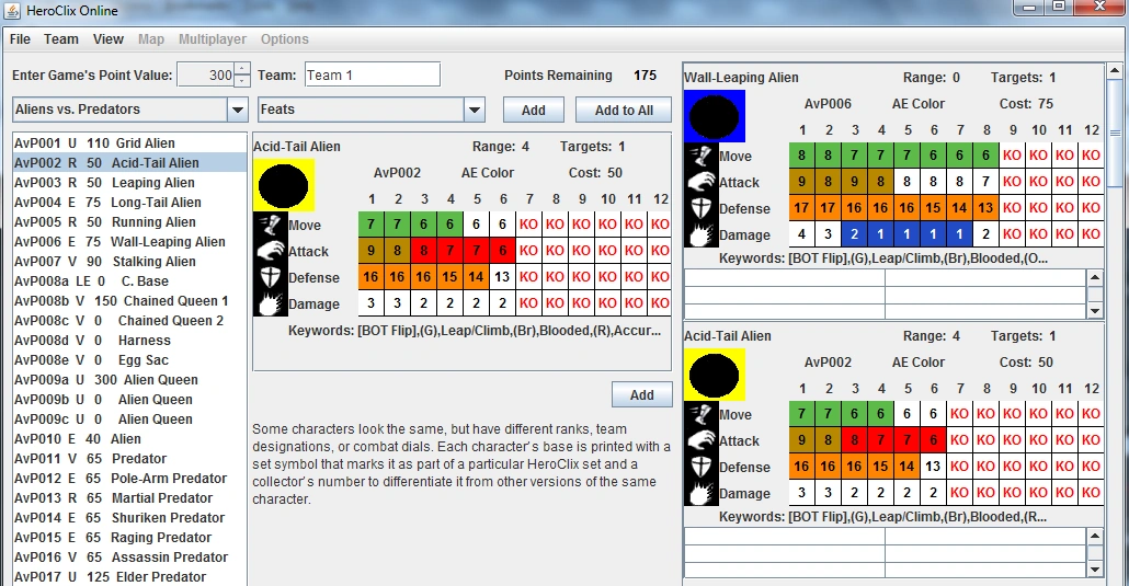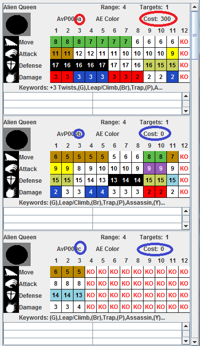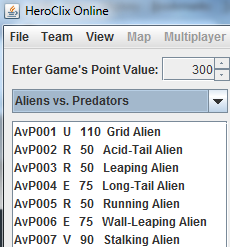 HorrorClix Online cannot create figures with more than 11 clicks of life. Therefor, some large-based monsters such as Alien Queen and Giant Robot are split into two or more parts. You must add all parts of the monster to your team in order to use the figure. The collector numbers of these monsters will end in a letter. The Alien Queen, for example is split into AvP009a, AvP009b and AvP009c. The first part of the figure will display its full point value, while all other parts cost 0 points so that your build total is calculated correctly.
