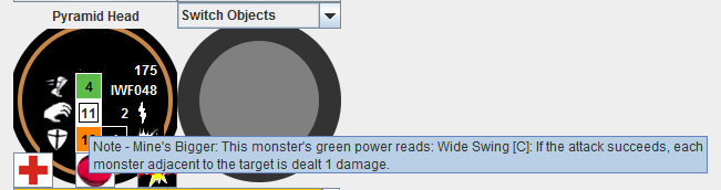 For monsters with Continuous Powers and HorrorClix 1.5 powers, or any other uncommon features that need to be explained, notes are used to provide the specific text of them wherever possible. Notes in HorrorClix Online come in the form of the "Special Power" feature from HeroClix. White squares on the dial would represent special powers in HeroClix, but in HorrorClix Online they are placed on the dial in places where no actual power is located. Mousing over these squares reveals the text of the note.