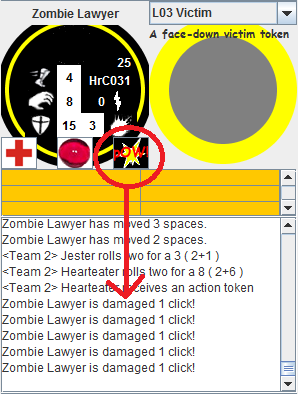Clicking it will cause your friendly selected figure to take 1 damage. This will be displayed in the chat window, and a comic book sound effect will appear over the figure.