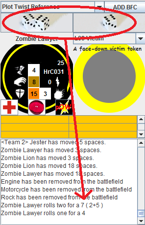 HorrorClix Online uses 2 buttons for rolling dice. There's the d6 button and the 2d6 button. These are pretty self-explanatory. Clicking the buttons will roll virtual dice and display the result in the game chat.