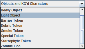 The first item on the Objects list is an Engine, a generic heavy object from Heroclix. This is followed by every special object in the game.