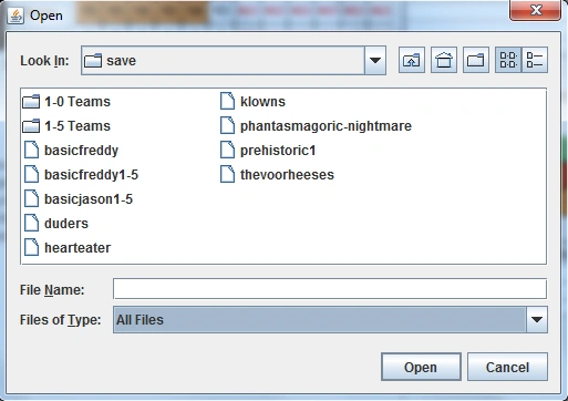 This will bring up very simple Save/Load dialogs. Team files don't use any known file extension. A number of pre-built teams have been included with the program.